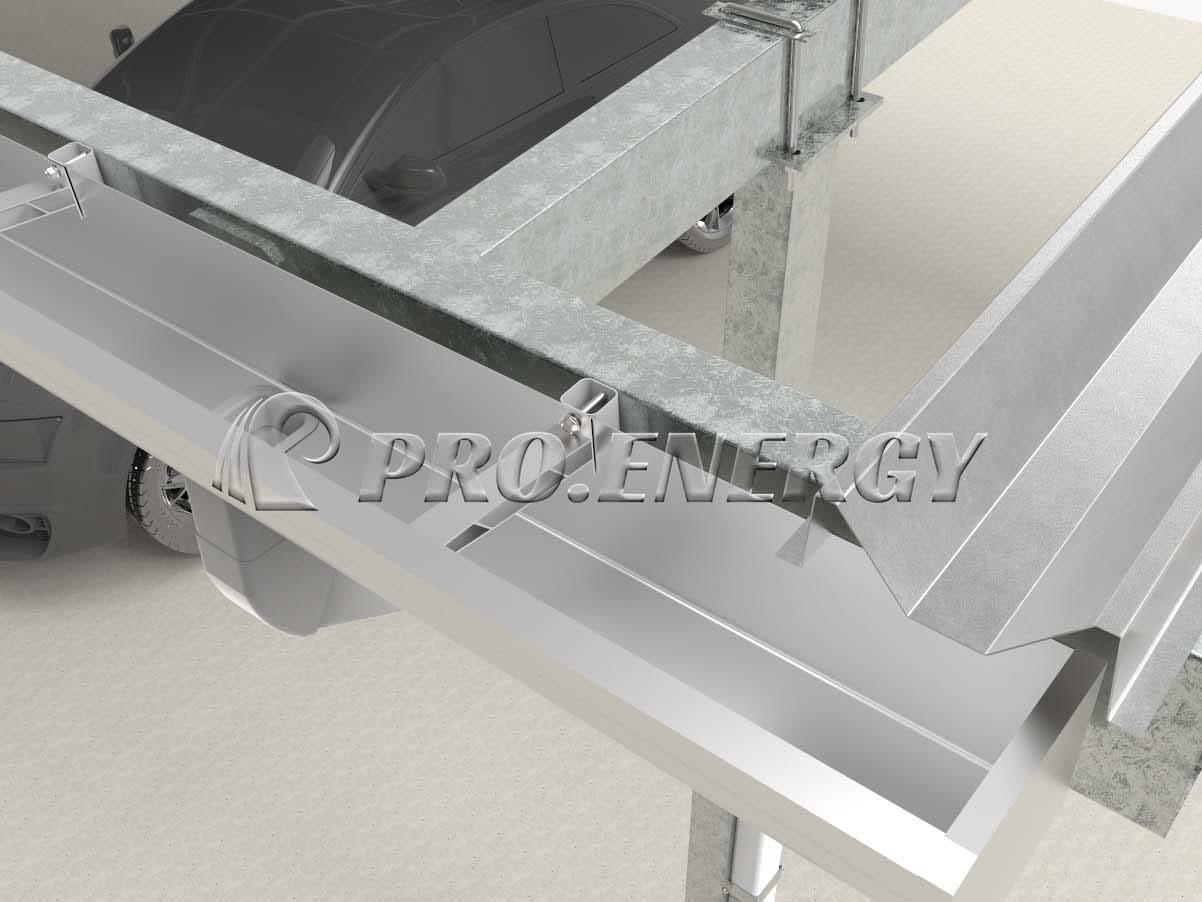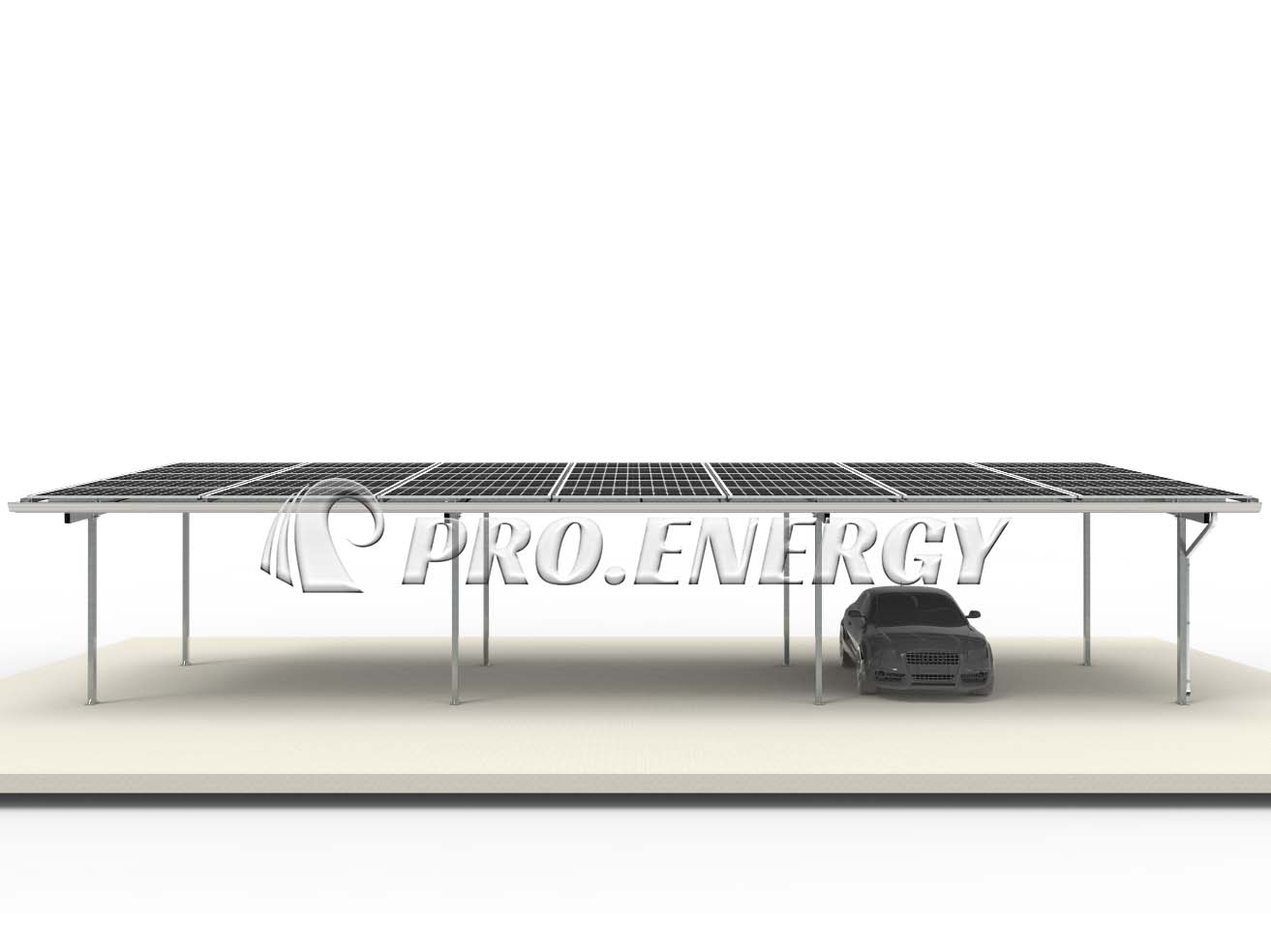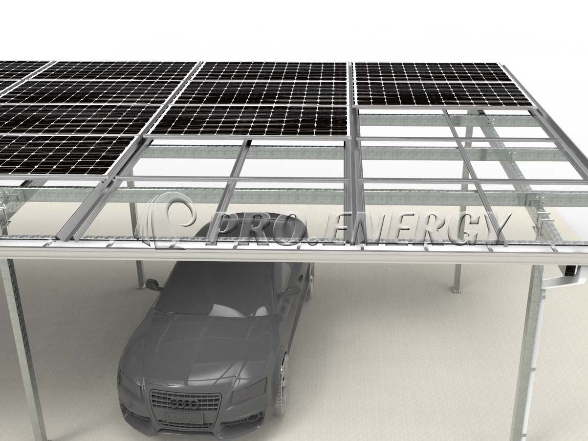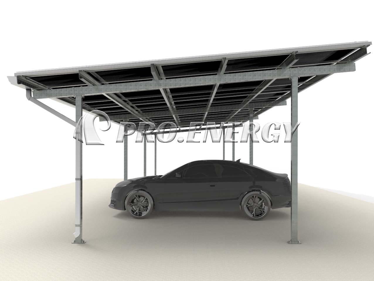 Struttura per parcheggio a energia solare con doppia colonna in acciaio a forma di II.